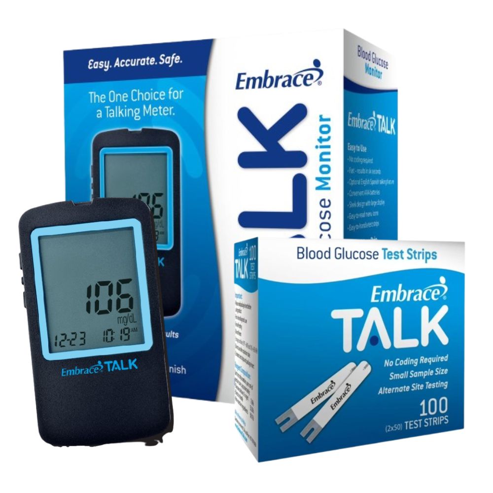 The Omnis Health Embrace Talk Blood Sugar Monitoring Kit is an accessible and reliable choice for individuals seeking a user-friendly glucose monitoring system. Designed with convenience and comfort in mind, the Embrace Talk Meter offers an optional talking feature in English and Spanish—making it especially helpful for users with visual impairments or those who prefer audio guidance.