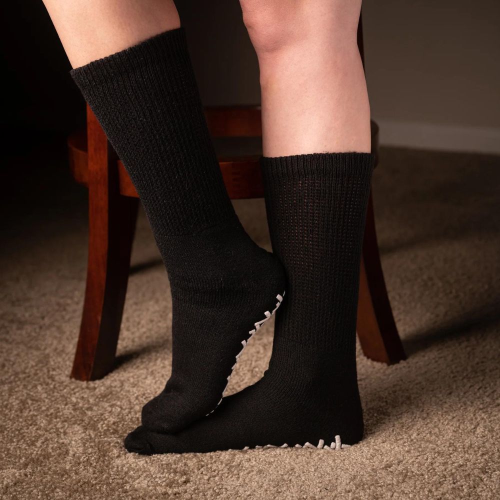 Choosing the right socks is crucial for individuals with diabetes, as they are at a higher risk of developing foot-related complications. The CareApparel CareActive Diabetic Non Skids Crew Socks are designed with the specific needs of individuals with diabetes in mind, providing a non-binding, loose-fitting top that promotes optimal circulation, a cushioned lining that offers pressure relief and maximum foot protection, and a non-skid bottom that ensures safety and stability while walking on slippery surfaces. These socks are also made from a delicate cotton blend that is breathable and comfortable for all-day wear. By choosing the right socks, individuals with diabetes can take an important step towards maintaining healthy feet and preventing complications.