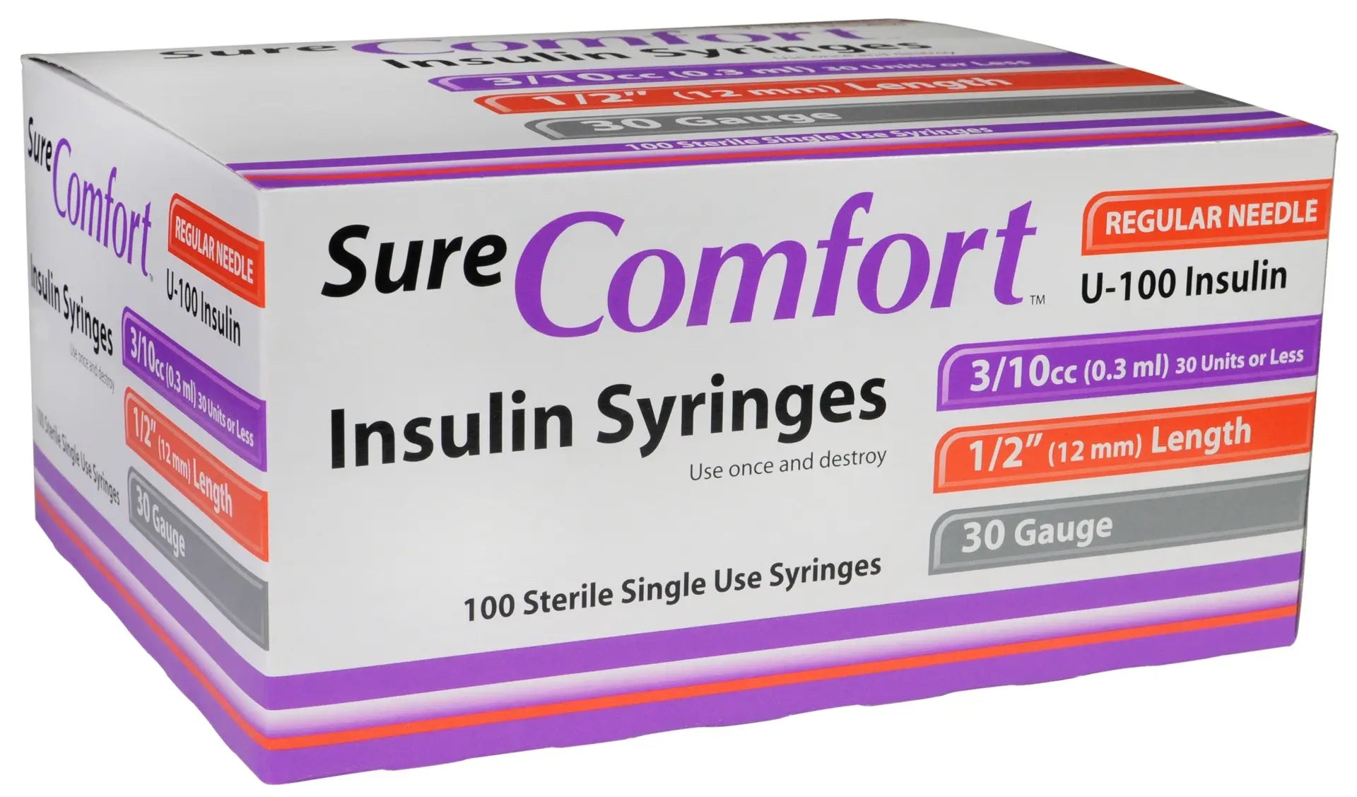 Sure Comfort insulin syringes are available in multiple insulin syringe sizes, including 0.3 mL, 0.5 mL, and 1 mL, with clear, bold graduations and permanent markings for accurate dosing. These U100 insulin syringes feature low dead space to minimize insulin waste, UV-bonded needles for added stability, and an oversized finger grip for improved control. All syringes come complete with attached needles, so they are ready to use as insulin syringes with needles right out of the box.